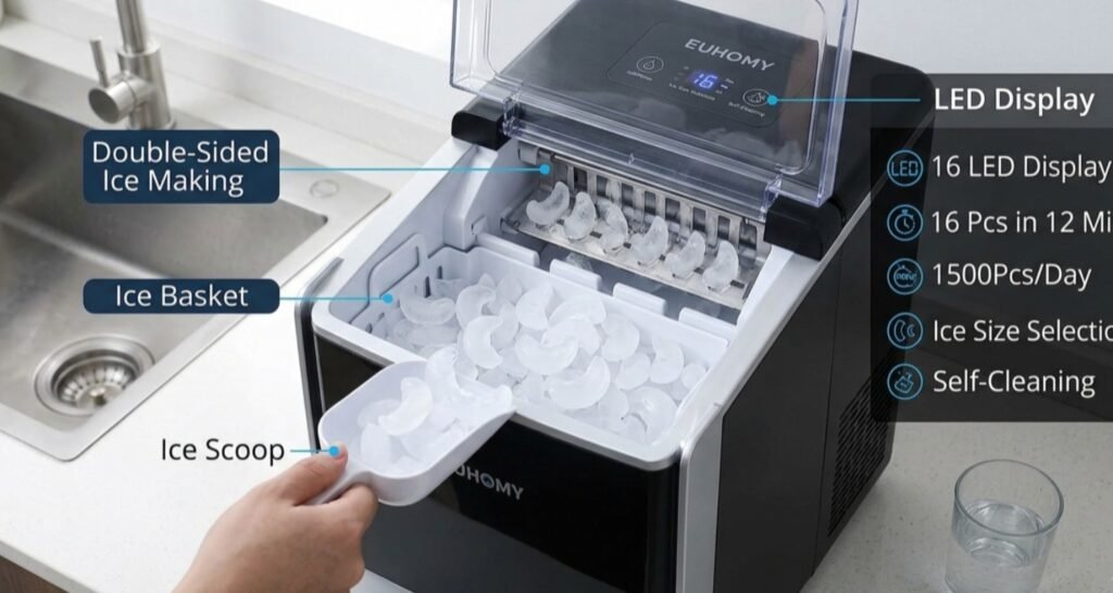 The EUHOMY LunaArc Crescent Ice Maker:Your Go To Portable Countertop Solution for Fresh Ice Anytime.